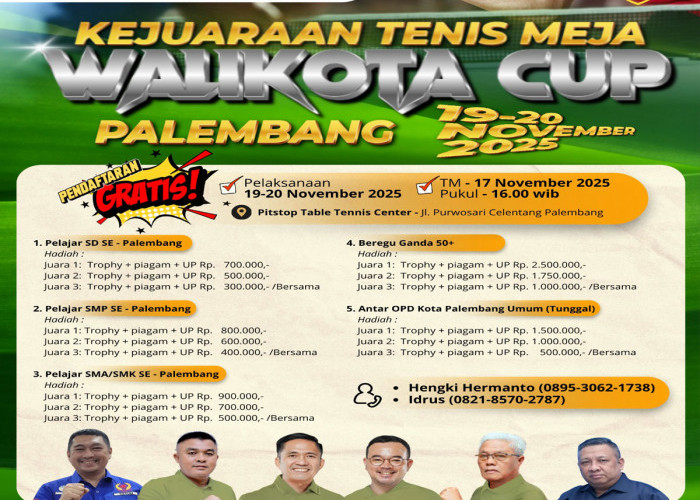 "Pendaftaran, dapat menghubungi Sukriyati di nomor 0819 95195919 dan Endang 0812 7273483. Pendaftaran ditutup pada tanggal 10 Desember 2025 dan technical meeting dilaksanakan pada tanggal 11 Desember 2025 di GOR Tenis Meja Pitstop Palembang," jelasnya.